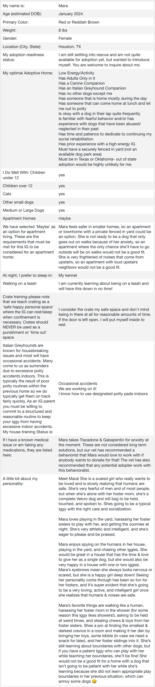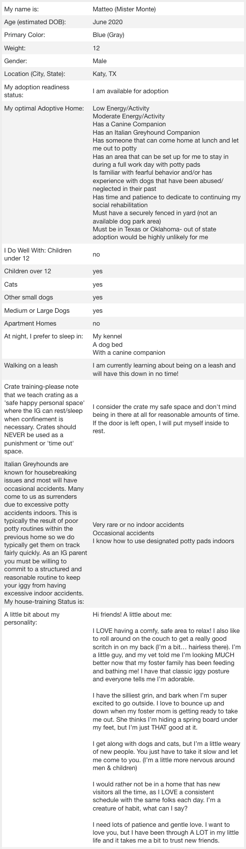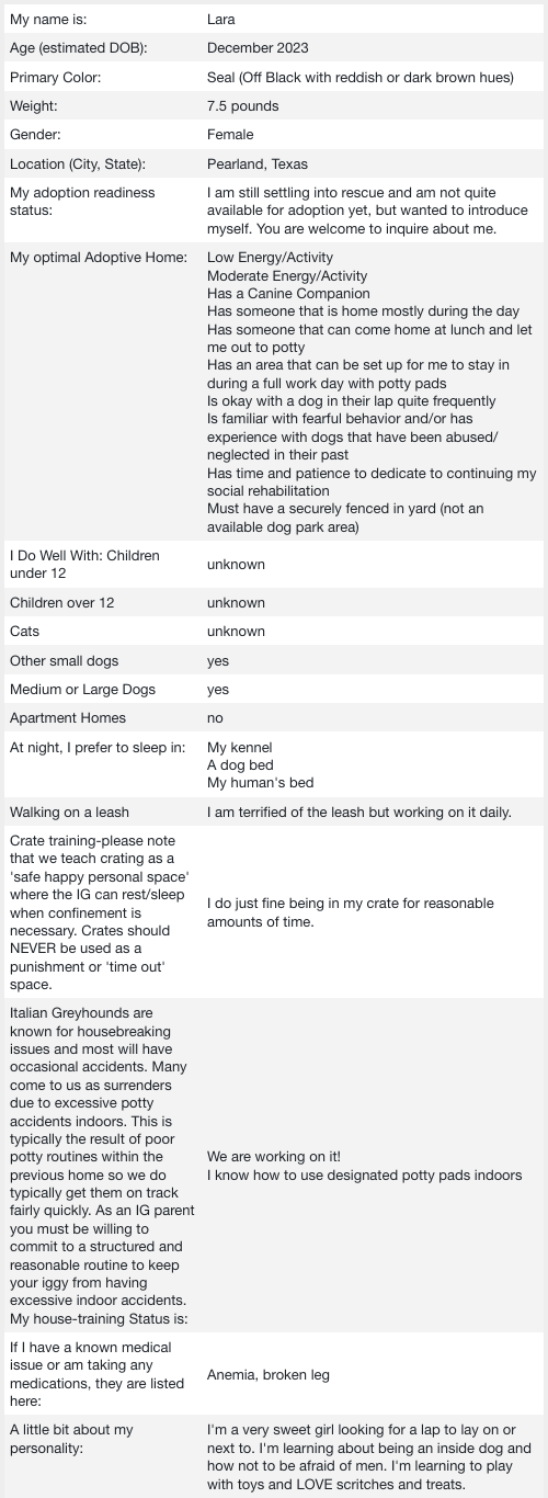 If you are seriously thinking about adopting an IG, here are some things to consider. Are you ready to adopt? Submitting an adoption application is the first step, and is required before meeting specific foster dogs in which you may have an interest. Click here for the adoption application.